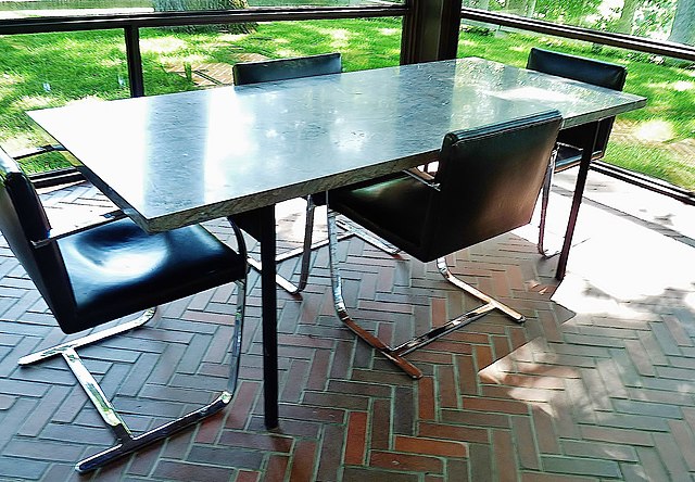Si la Glass House est une œuvre avant-gardiste, elle s’inscrit pleinement dans le style international, un mouvement architectural moderne qui s’est développé aux États-Unis, influencé par le Bauhaus européen. Bien qu’elle présente des similitudes avec les œuvres de Mies van der Rohe, notamment la Farnsworth House (1951), elle n’en est pas une inspiration directe. Conçue à la même période, la maison de Philip Johnson traduit une vision épurée et radicale de l’architecture, où structure et transparence redéfinissent l’habitat.